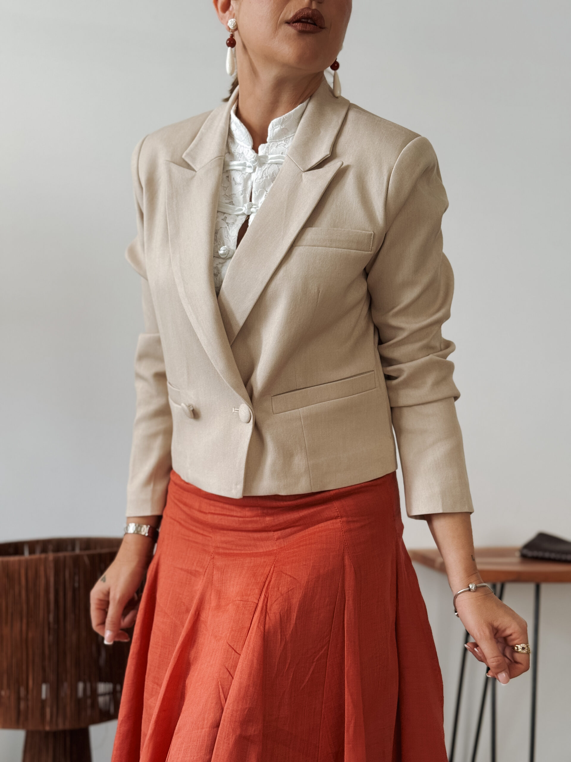 Chaqueta torera beige abotonada con hombreras y forro interior.