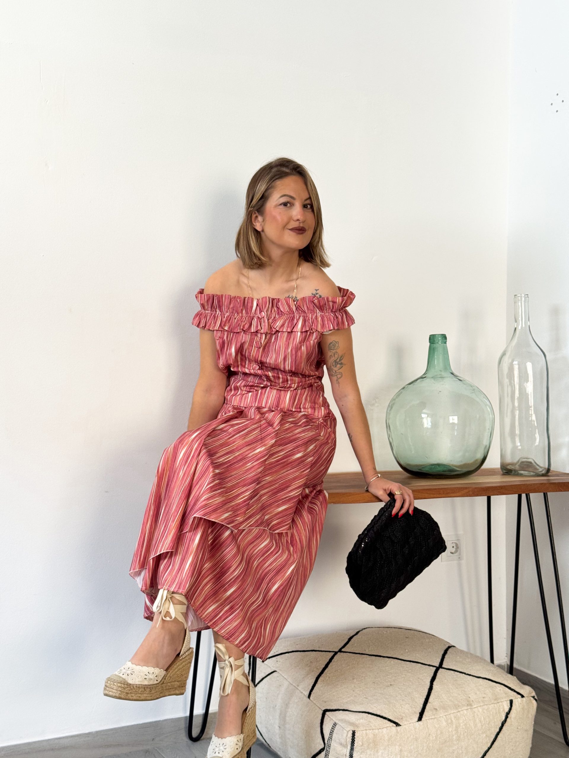 Conjunto estampado formado por top y falda asimétrica. Top con hombros y cintura elástica.