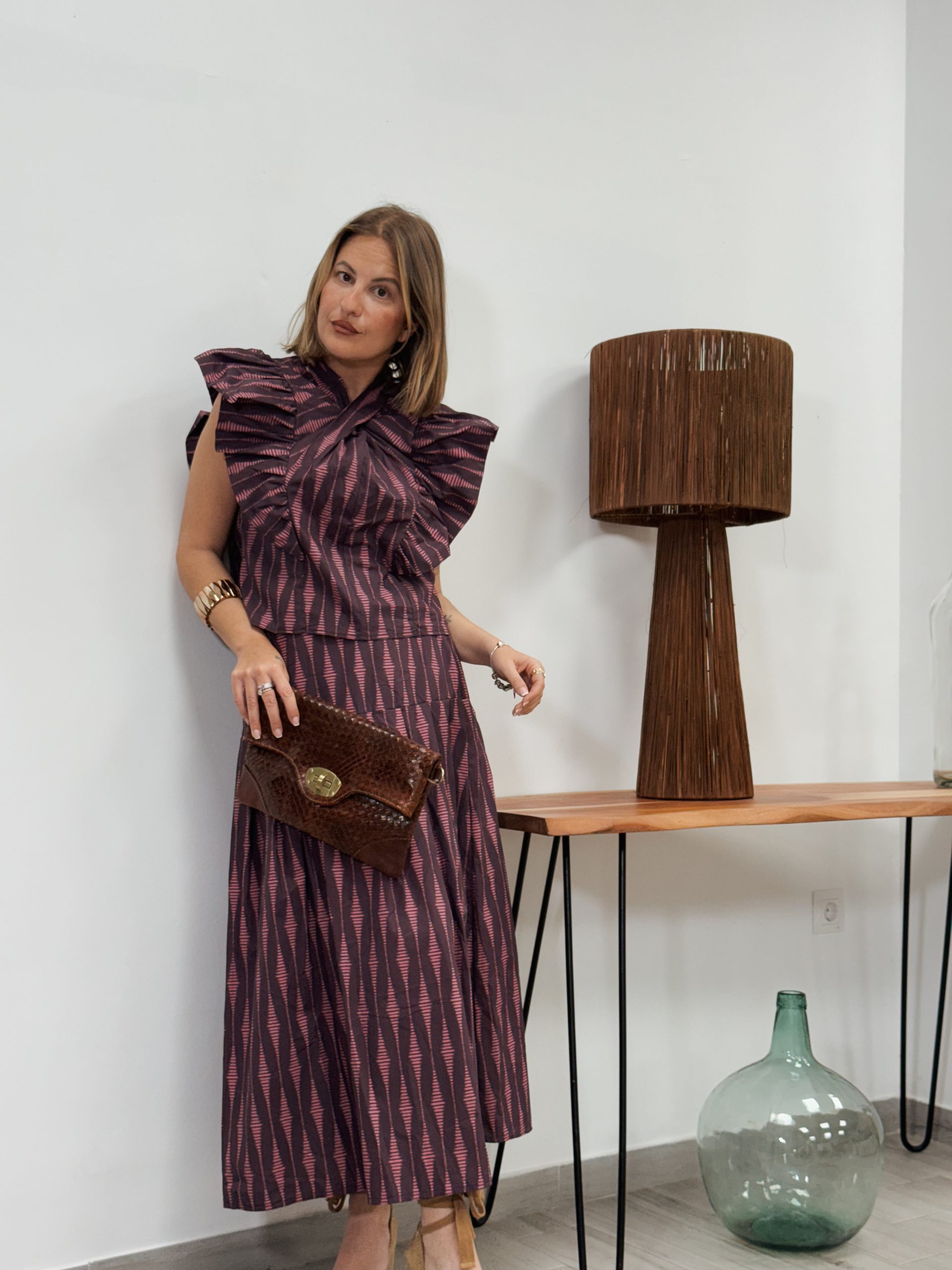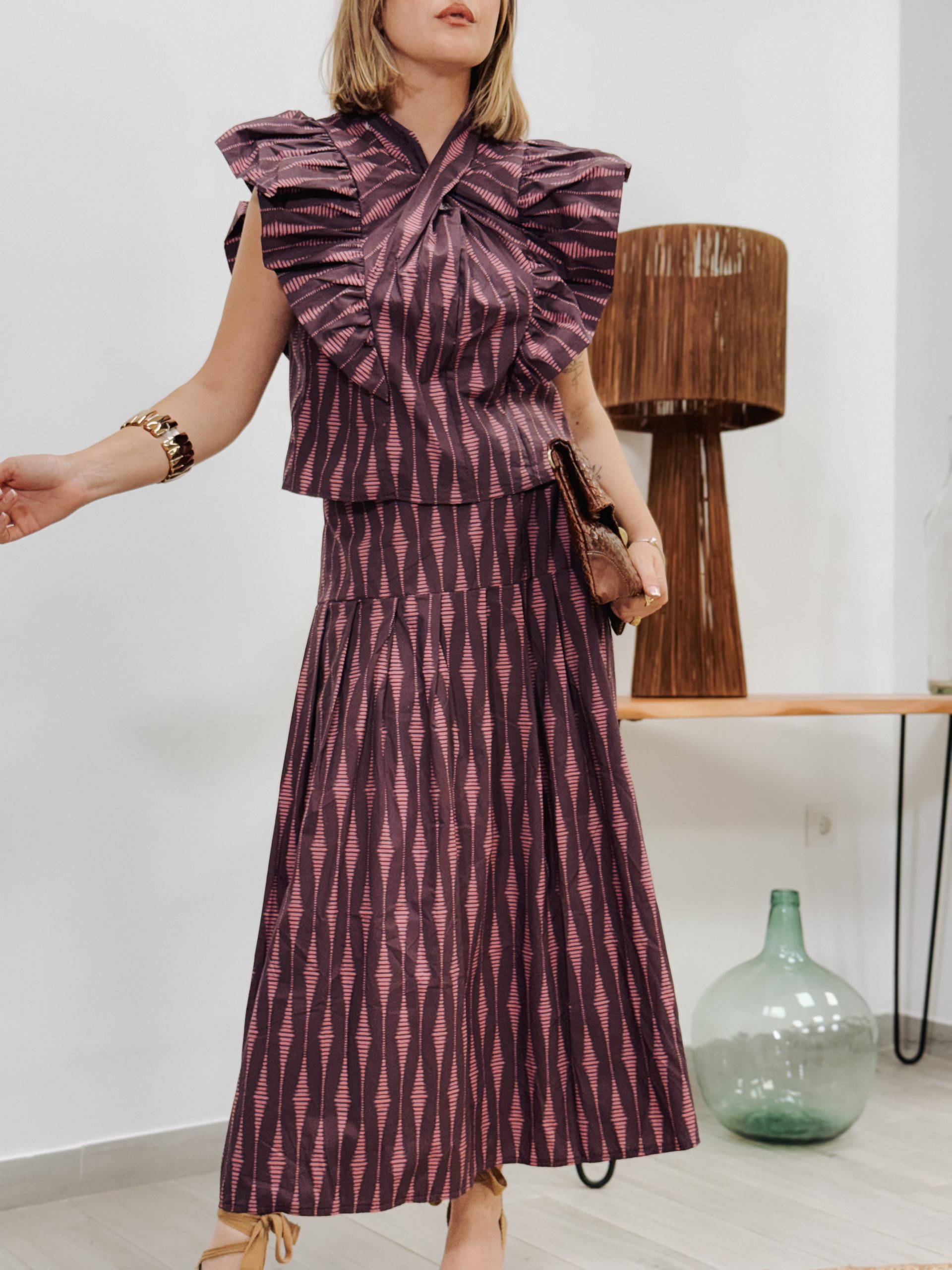 Conjunto formado por blusa con detalle de volante en la sisa y falda con cintura con goma trasera elástica