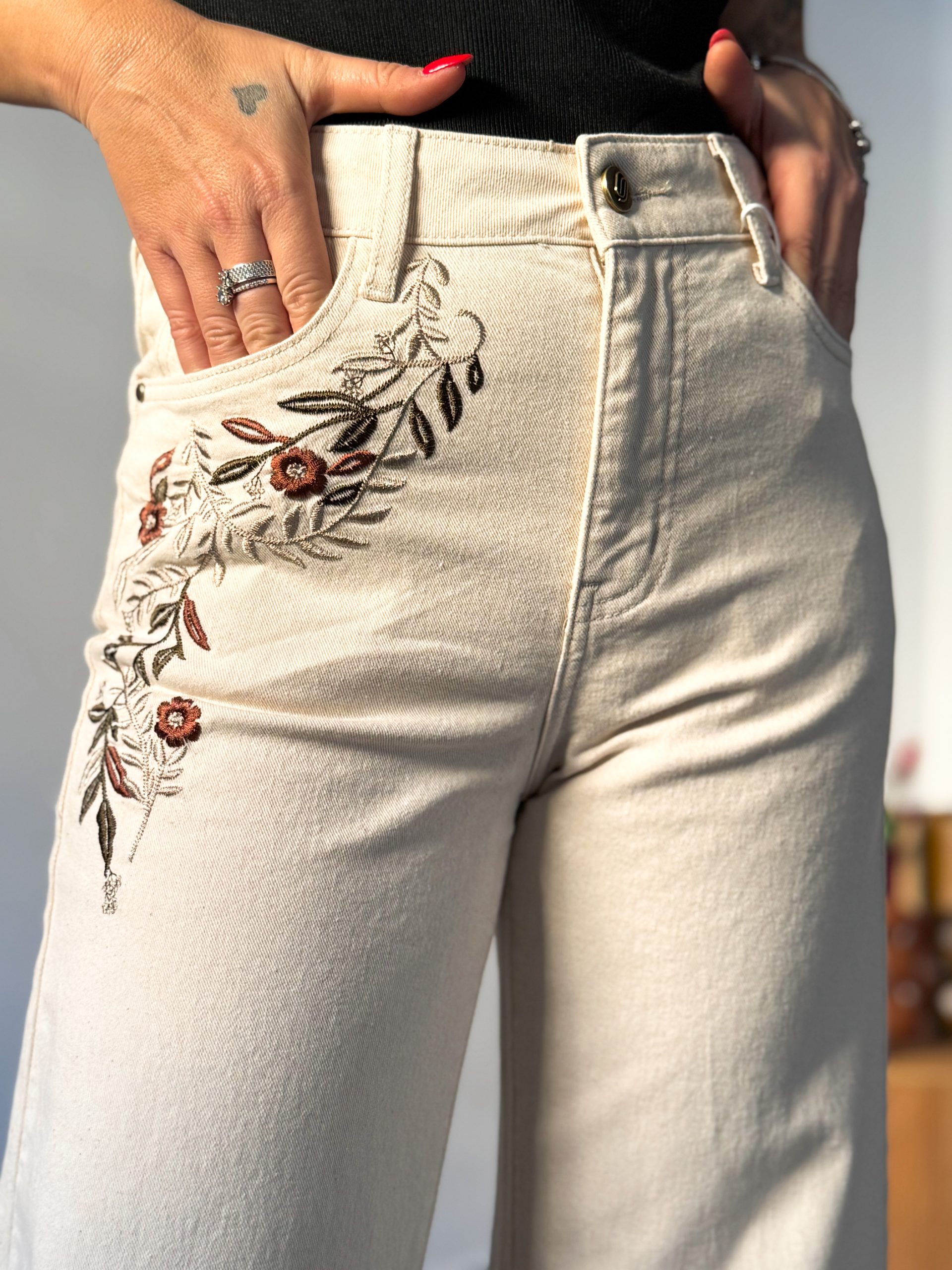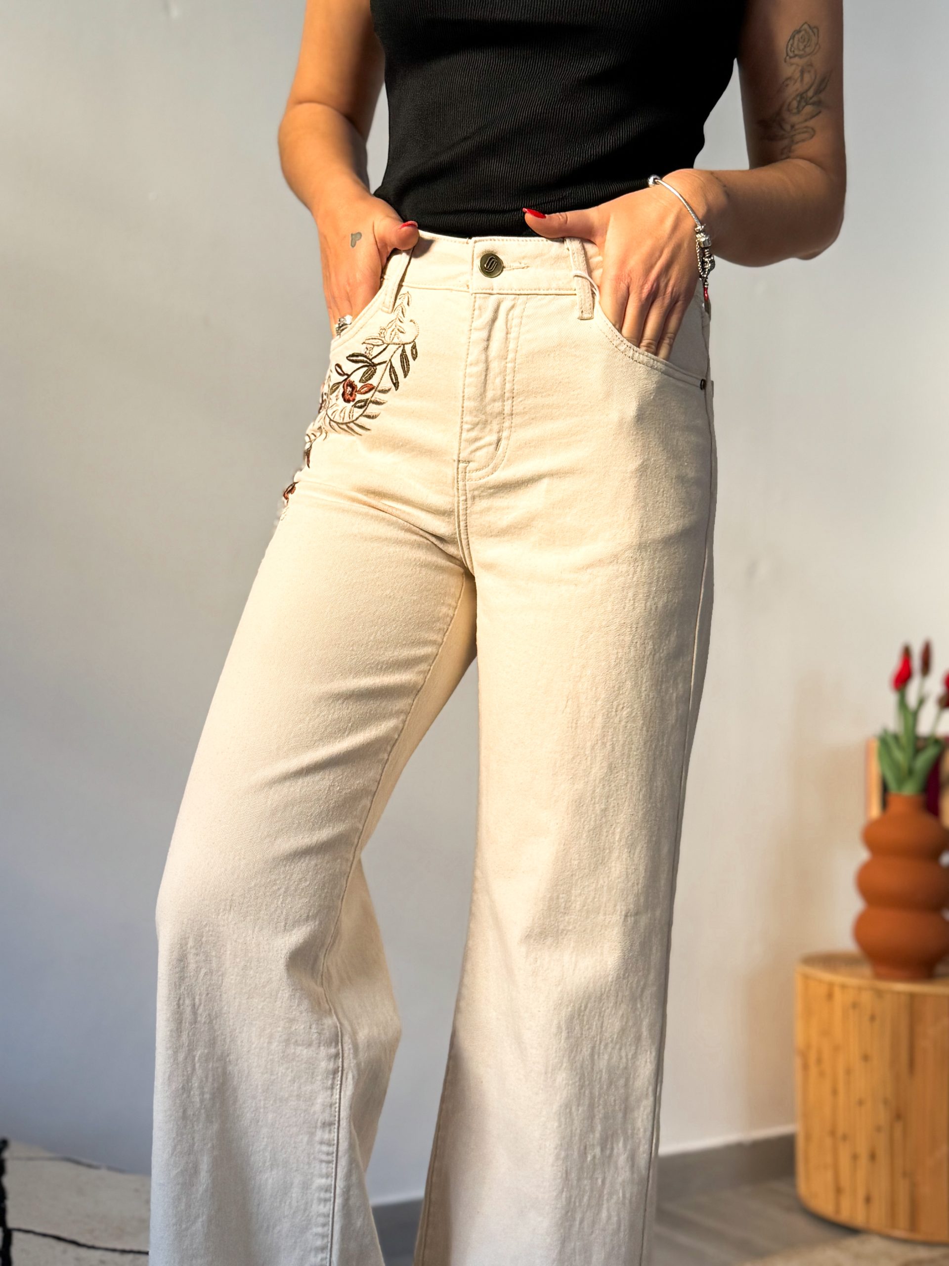 Pantalón vaquero beige bordado de tiro alto.