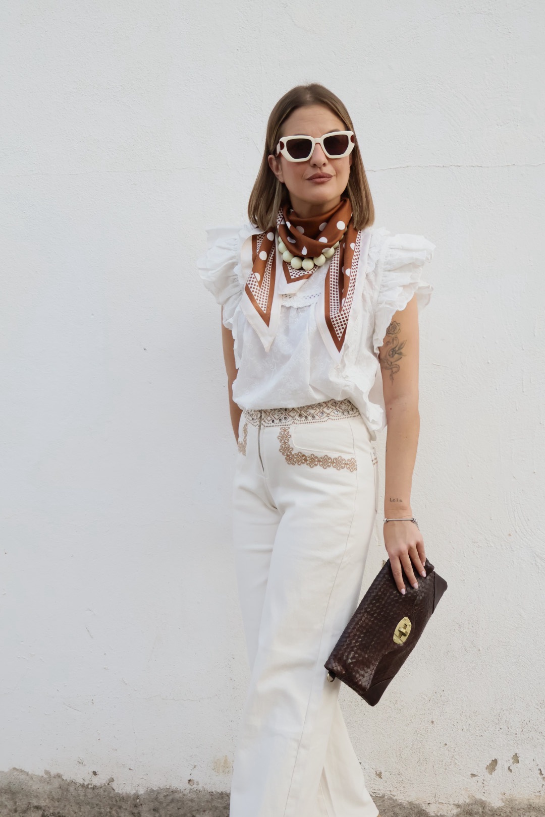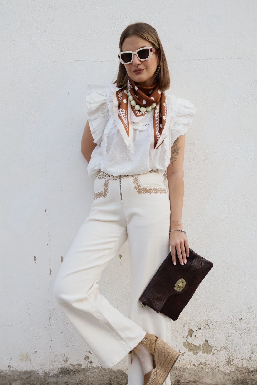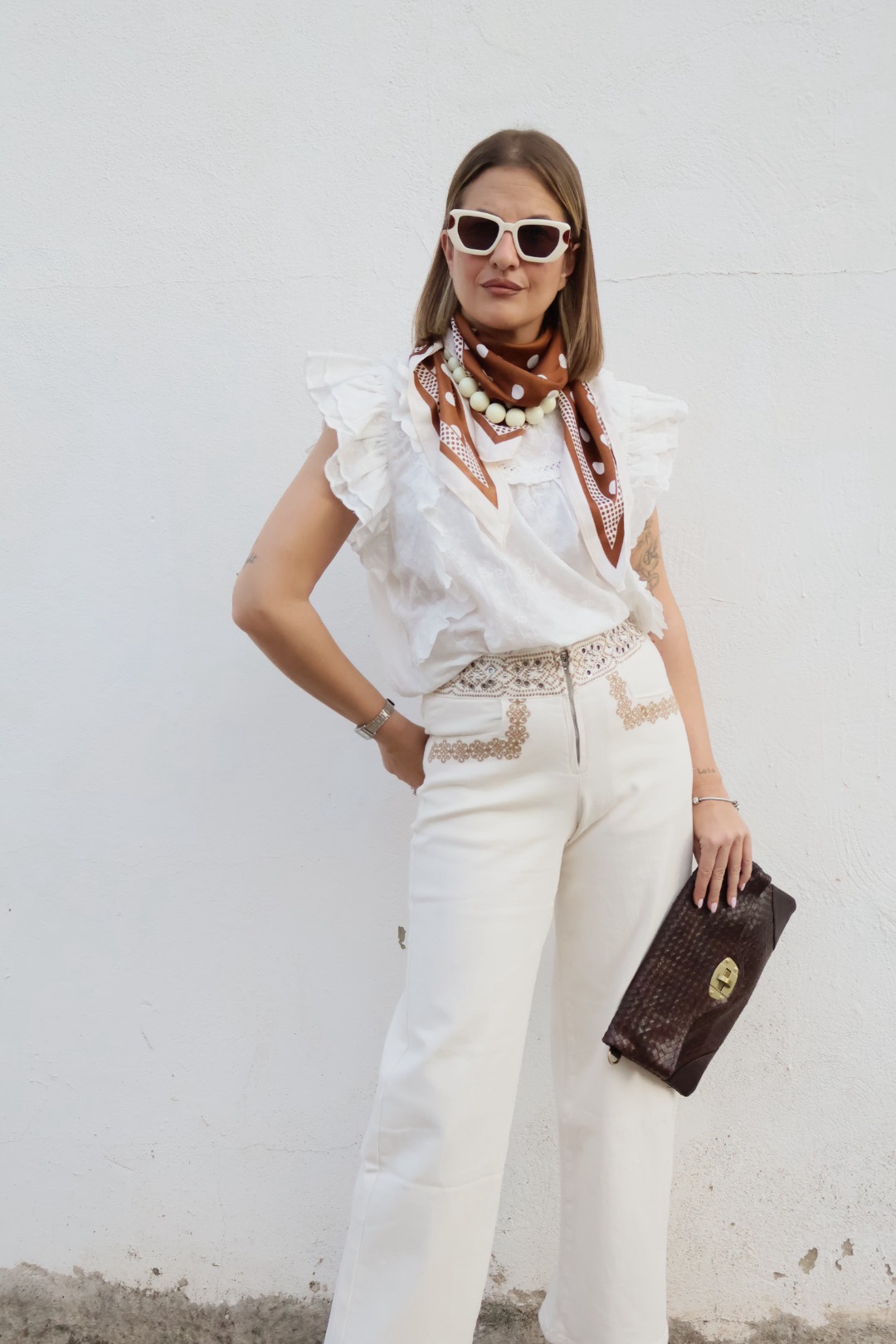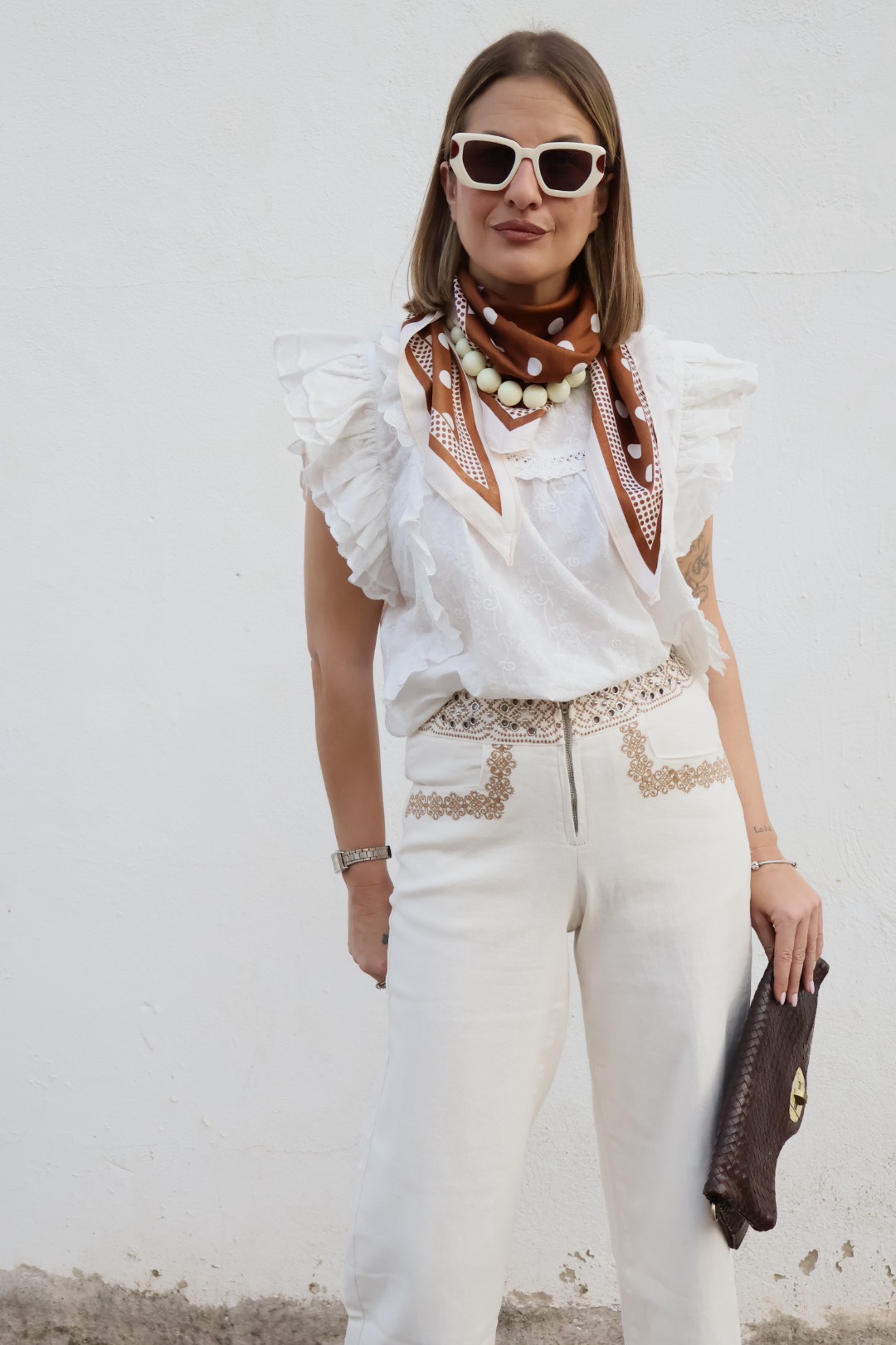Pantalón beige de algodón de tiro medio con bordados.