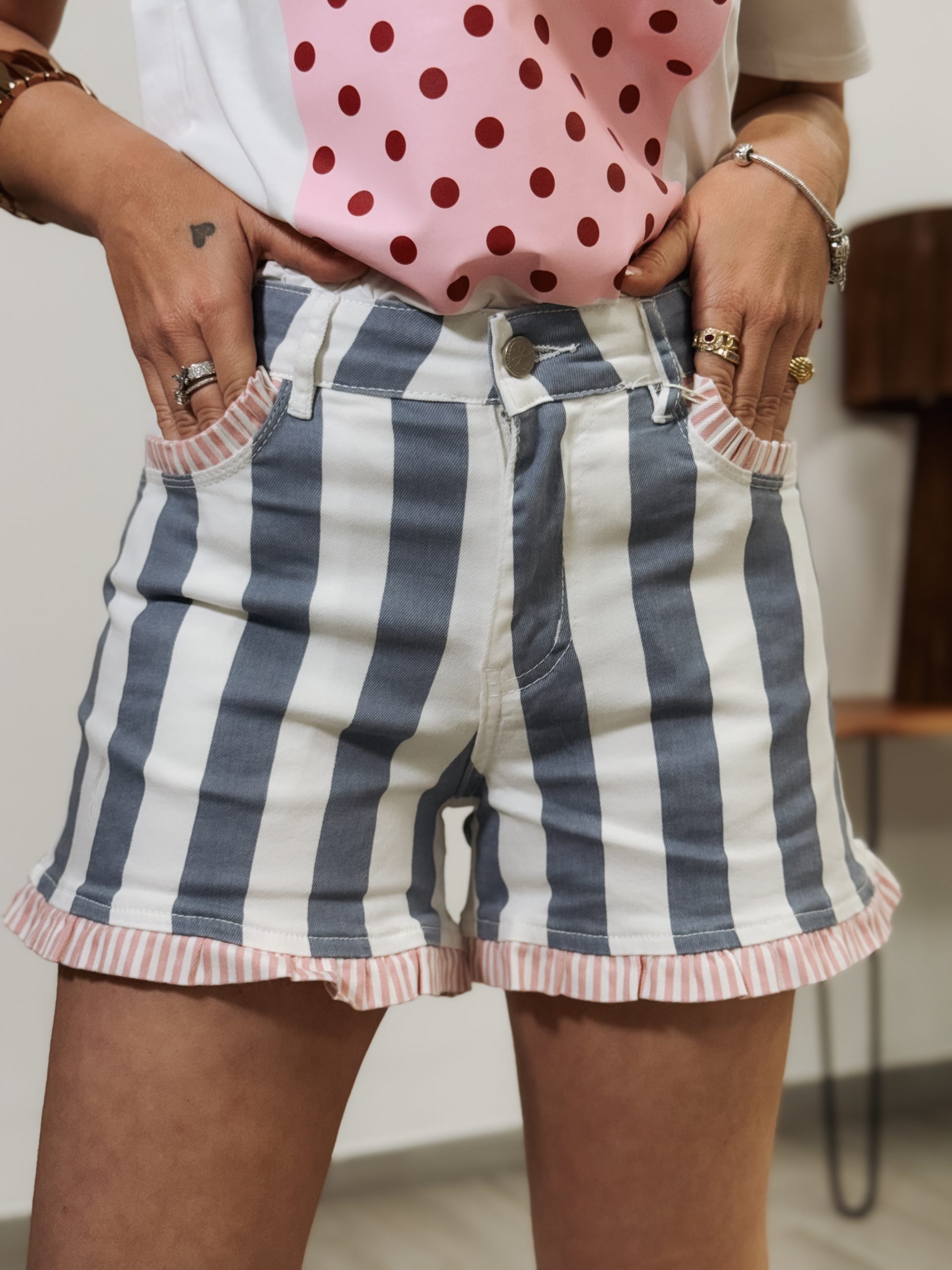 Short de tiro alto con rayas azules combinado con ribete rosa