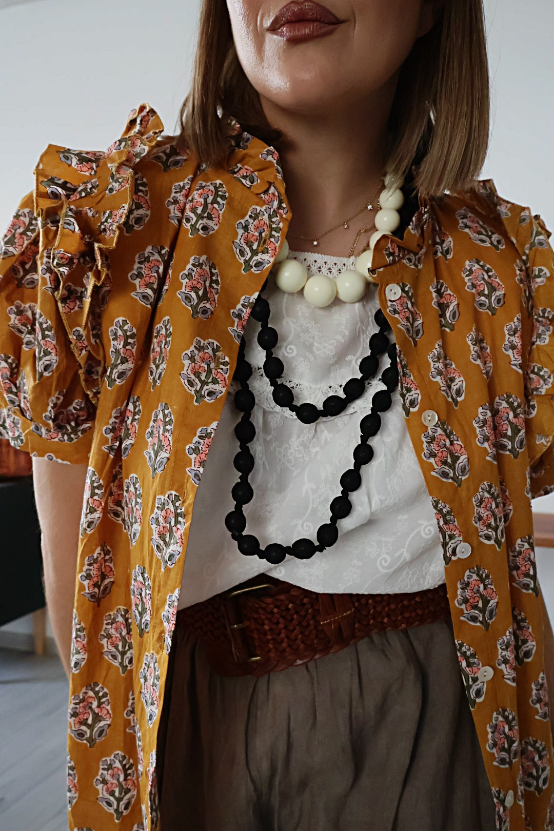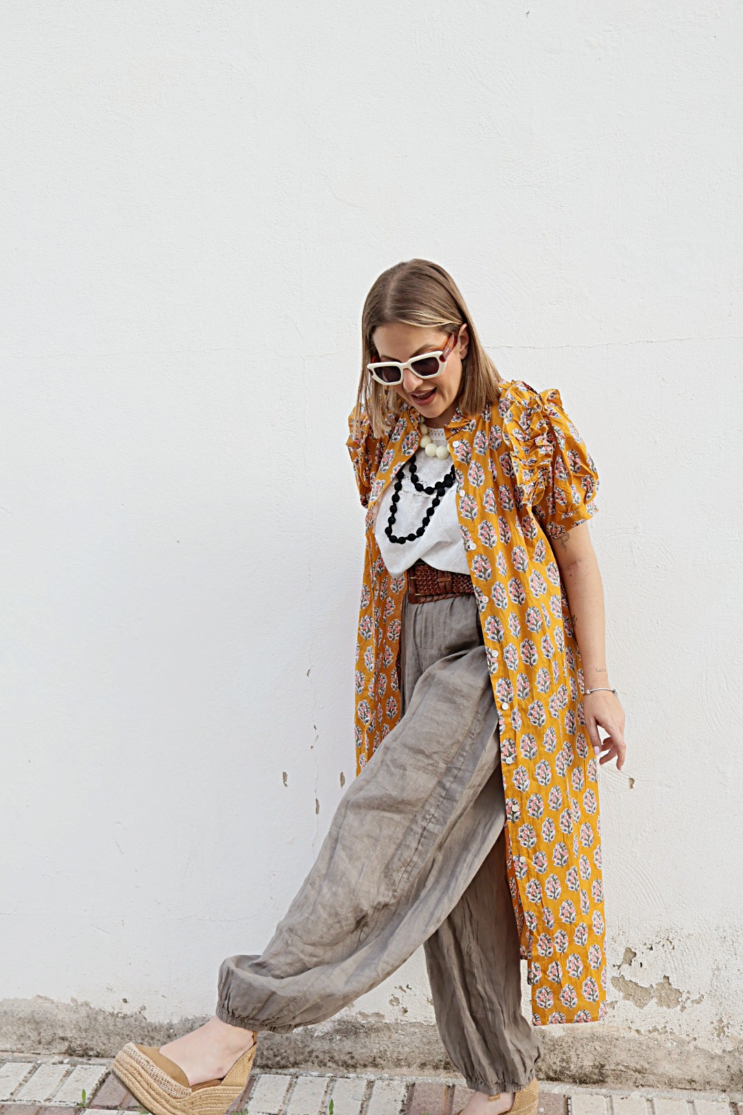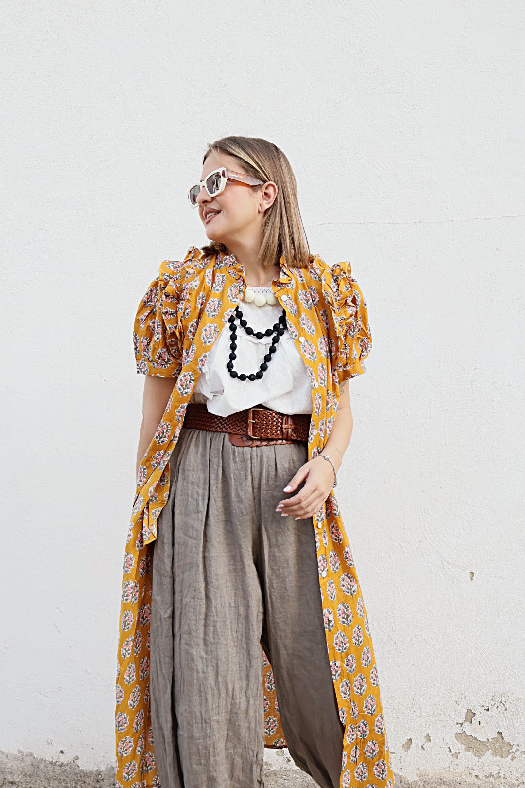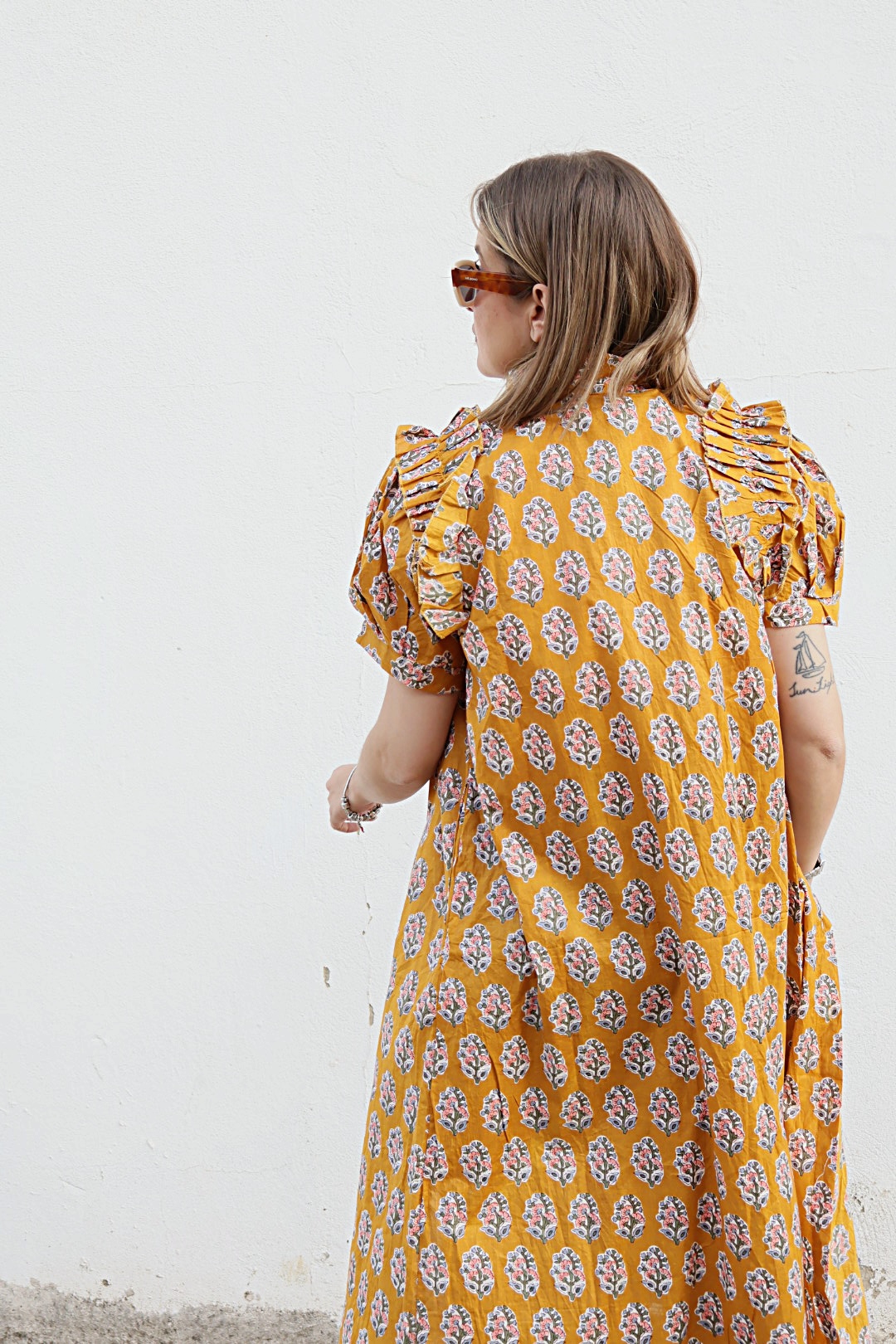 Vestido indio pintado a mano en color mostaza, mangas abullonadas.